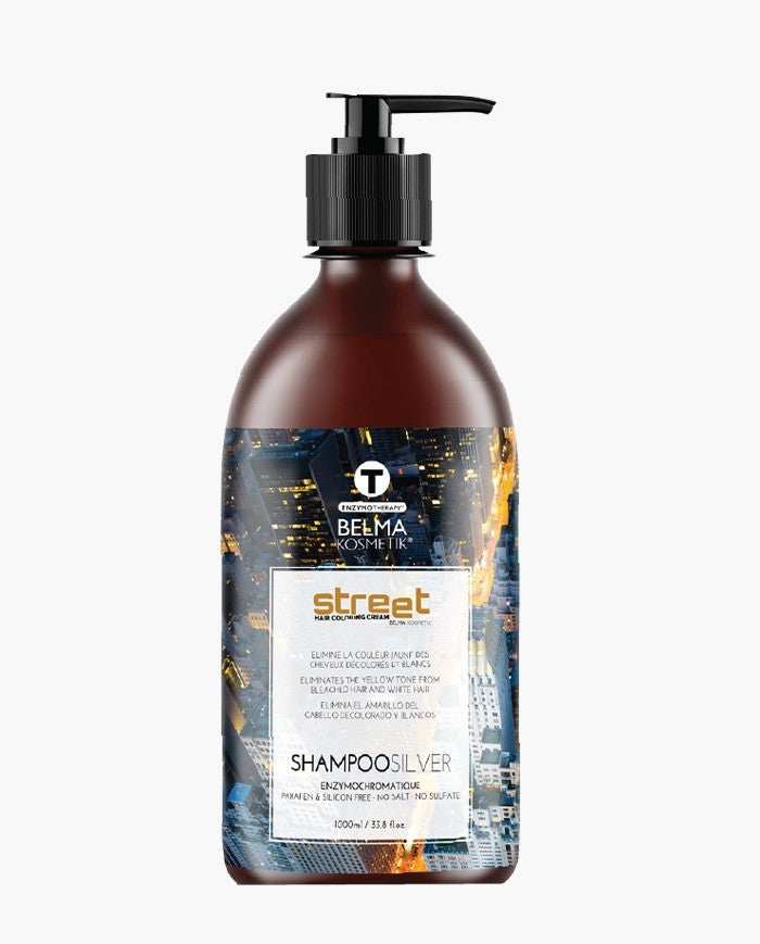 Street Color - Shampoo Silver es un champú profesional con pigmentos violetas diseñado para eliminar los reflejos amarillos no deseados del cabello rubio, decolorado o blanco. Aporta un tono plateado moderno, mejora la luminosidad y deja el cabello suave y brillante.